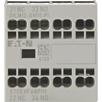 Module de contacts auxiliaires, avec contacts liés positivement, Fonction : pour les applications standard, 2 pôles, Technique de raccordement : Bornes Push-In, Ith 16 A, Courant assigné d’emploi AC-15 220 V 230 V 240 V : Ie= 4 A, Courant assigné d’emploi AC-15 380 V 400 V 415 V : Ie= 4 A, Contacts F = contact à fermeture : 1 F, Contacts O = contact à ouverture : 1 contact O, Type de montage : Fixation avant, Utilisation avec : DILA…-PI, DILM7…-PI, DILM9…-PI, DILM12…-PI, DILM15…-PI, DILMP20…-PI, Type : Contact auxiliaire à montage frontal