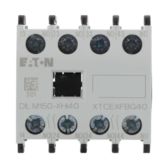 Module de contacts auxiliaires, avec contacts liés positivement, Fonction : pour les applications standard, 4 pôles, Technique de raccordement : Borniers à vis, Courant assigné d’emploi AC-15 220 V 230 V 240 V : Ie= 6 A, Courant assigné d’emploi AC-15 380 V 400 V 415 V: Ie= 4 A, Contacts F = Contact à fermeture : 4 F, Type de montage : Fixation avant, Utilisation avec : DILM40…, DILM50…, DILM65…, DILM72…, DILM80…, DILM95…, DILM115…, DILM150…, DILM170…, DILMP63…, DILMP80…, DILMP125…, DILMP160…, DILMP200…, DILMF40…, DILMF50…, DILMF65…, DILMF80…, DILMF95…, DILMF115…, DILMF150…, Type : Contact auxiliaire à montage frontal