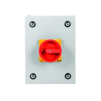 Hoofdschakelaar, P1, Nominale ononderbroken stroom (Iu): 25 A, Functies: Nooduitschakelfunctie, Vergrendelbaar, Uitgerust met: Rode draaigreep en gele vergrendelring, Montagewijze: Opbouw, Aantal polen: Driepolig, Vergrendelingsvoorziening: Vergrendelbaar in de stand 0 (Uit), Beschermingsgraad: NEMA 12