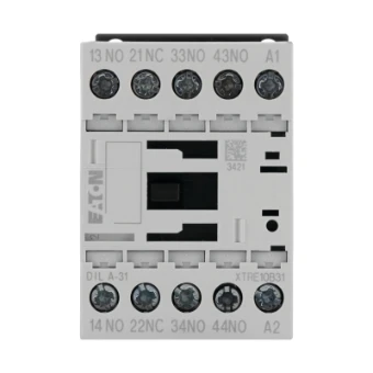Contacteur auxiliaire, Gamme de produits : Contacteurs auxiliaires DILA, Application : Contacteurs auxiliaires, Description : Appareils de base avec contacts liés positivement, Technique de raccordement : Borniers à vis, Courant assigné d’emploi AC-15 220 V 230 V 240 V : Ie= 4 A, 380 V 400 V 415 V: Ie= 4 A, Contacts F = contact à fermeture : 3 F, Contacts O = contact à ouverture : 1 O, Nombre caractéristique : 31E, Combinaison possible avec un module de contacts auxiliaires : DILA-XHI(V)..., Tension de commande : 42 V 50/60 Hz, Type de courant CA/CC : Bobine AC, Degré de protection: IP20, Instructions : Contacts selon EN 50011, Repérage des bornes de bobine selon EN 50005