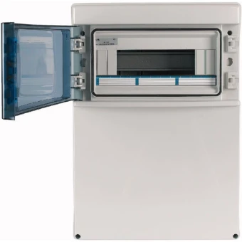 IKA vochtige omgeving compacte verdeler; RAL 7035, met nulleider- en aardklemmen; CNC ingeschuimde pakking voor IP65-beschermingsgraad zoals gedefinieerd in IEC/EN 62208; 18 plaatseenheden; eenrijig; UV-bestendig zoals gedefinieerd in DIN EN ISO 4892-2; goedgekeurd voor verdelers voor gebouwentechniek conform IEC/EN 61439-3 VDE 0660-600-3; geïntegreerde modulecompensatie voor verschillende apparaatbreedten; metrische kabeluitsparingen met centreerpunt: 100% polycarbonaat-behuizing (UV-bestendig)
