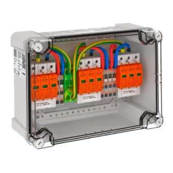 Generator connection box, type 1 + 2, for photovoltaic systems, to connect 3 x 1 string. For DC protection of the inverter.• Varistor arrester, plug-in, with separation device in error-resistant Y circuit according to VDE 0100-712 (50539-12)• Low DC protection level: < 3.0 kV (Uoc max = 900 V DC)• 3 protection devices with 2 push-in terminals each of up to 6 mm² pre-installed in the housing, up to 41 A DC per terminal• Polycarbonate housing (IP67), UV-resistant for exterior use, incl. cable gland set and pressure compensation elementAdditional measures may be required if there is the risk of condensation formation through wind, ice, temperature or sun!