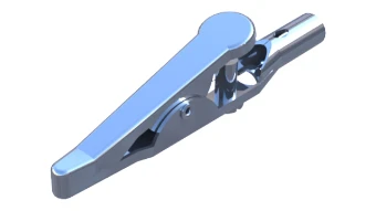 Vernikkeld stalen krokodillenklem. Klembereik tot een maximale boutdiameter van 5 mm. Busaansluiting van 4 mm diameter, aansluiting mogelijk met klemschroef en soldeerverbinding.