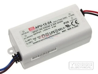 LED voeding in kunststof behuizing IP30 klasse 2. Primair 90-264VAC. secundair 24VDC 12W.Beveiligd tegen kortsluiting overbelasting en overspanning.