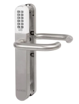 Flexess Aero Extra est une garniture de porte avec clavierà code et combinée avec un lecteur de badges qui peut êtremontée sans difficulté sur des serrures mécaniques. FlexessAero Extra fonctionne avec des batteries ; aucun câblagen’est donc nécessaire. L’actionnement des garnitures estpossible à l’aide d’un code de votre choix ou de badgesMIFARE®. La programmation est simple et peut se faire sanséquipement supplémentaire. Il est toujours possible d’utiliserla béquille du côté intérieur.Flexess Aero Extra est équipé d’une indication acoustiqueet d’un éclairage d’état et est étanche conforme à la classede protection IP68, donc adapté pour une installation enextérieur. La serrure peut toujours être ouverte et verrouilléeà l’aide de la clé par l’intermédiaire du cylindre optionnel.