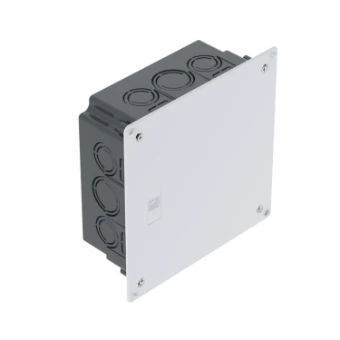 Boîtier de dérivation encastré pour pour bornes de raccordement, pose dans maçonnerie d'au moins 65 mm de profondeur. Avec couvercle et vis de couvercle (15 mm). Bord du couvercle affleurant, surface du couvercle rugueuse. • 4 entrées combinées pour gaines latérales Ø 34,6 et 28,5 mm• 8 entrées combinées pour gaines latérales Ø 28,5 et 21,5 mm• 8 entrées latérales pour câbles plats/rubans conducteurs• 2 entrées 28,5 mm dans le sol• 2 entrées pour câbles plats/rubans conducteurs dans le sol