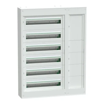 Dit Prismaset S-omhulsel is een opbouwmontage distributieomhulsel met een zijgoot links of rechts. Deze metalen en kunststof behuizing is samengesteld uit 6 rijen van 24 modules van 18mm. Het kan alle types van modulaire schakeluitrustingen omvatten. Het omhulsel en de zijgoot hebben een grotere ruimte op de eerste rij om de NSXm 160 binnenkomende stroomonderbreker of schakelaar aan te passen, indien nodig uitgerust met een aardlekbeveiligingsmodule. Dit omhulsel is bestemd voor installatie binnen. De IP-beschermingsgraad is IP41 met deur en IP30 zonder deur. Er kan een optionele deur over de behuizing worden geïnstalleerd. De kleur van de kast en de voorzijde is wit (RAL 9003). Dit gebruiksklare omhulsel is bedoeld voor gebruik in residentiële en tertiaire sectoren. Het is ontworpen voor elektriciens, en biedt ergonomie en flexibiliteit van de installatie. De kabels kunnen via de boven- of onderzijde van het omhulsel worden ingevoerd door verwijderbare kabelinvoerplaten. Het maakt inv