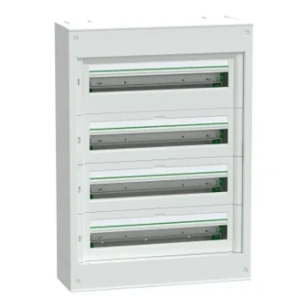 Deze Prismaset S-behuizing is een opbouwmontage distributiebehuizing. Deze metalen en kunststof behuizing is samengesteld uit 4 rijen van 24 modules van 18mm. Het kan alle types van modulaire schakeluitrustingen omvatten. Het omhulsel heeft een grotere ruimte op de eerste rij om de NSXm 160 binnenkomende stroomonderbreker of schakelaar aan te passen, indien nodig uitgerust met een aardlekbeveiligingsmodule. Dit omhulsel is bestemd voor installatie binnen. De IP-beschermingsgraad is IP41 met deur en IP30 zonder deur. Er kan een optionele deur over de behuizing worden geïnstalleerd. De kleur van de kast en de voorzijde is wit (RAL 9003). Dit gebruiksklare omhulsel is bedoeld voor gebruik in residentiële en tertiaire sectoren. Het is ontworpen voor elektriciens, en biedt ergonomie en flexibiliteit van de installatie. De kabels kunnen via de boven- of onderzijde van het omhulsel worden ingevoerd door verwijderbare kabelinvoerplaten. Het maakt invoer via kabel, buis of koker mogelijk. De be
