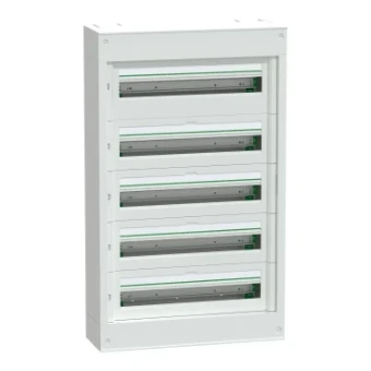Deze Prismaset S-behuizing is een opbouwmontage distributiebehuizing. Deze metalen en kunststof behuizing is samengesteld uit 5 rijen van 24 modules van 18mm. Het kan alle types van modulaire schakeluitrustingen omvatten. Het omhulsel heeft een grotere ruimte op de eerste rij om de NSXm 160 binnenkomende stroomonderbreker of schakelaar aan te passen, indien nodig uitgerust met een aardlekbeveiligingsmodule. Dit omhulsel is bestemd voor installatie binnen. De IP-beschermingsgraad is IP41 met deur en IP30 zonder deur. Er kan een optionele deur over de behuizing worden geïnstalleerd. De kleur van de kast en de voorzijde is wit (RAL 9003). Dit gebruiksklare omhulsel is bedoeld voor gebruik in residentiële en tertiaire sectoren. Het is ontworpen voor elektriciens, en biedt ergonomie en flexibiliteit van de installatie. De kabels kunnen via de boven- of onderzijde van het omhulsel worden ingevoerd door verwijderbare kabelinvoerplaten. Het maakt invoer via kabel, buis of koker mogelijk. De be