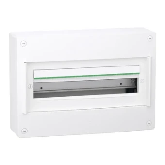 Deze Prismaset XS behuizing is een opbouwmontage distributiebehuizing. Deze kunststof behuizing is samengesteld uit 1 rij van 18 modules van 18mm. Het kan alle types van modulaire schakeluitrustingen omvatten. Dit omhulsel is bestemd voor installatie binnen. De IP-beschermingsgraad is IP40 met deur en IP30 zonder deur. Er kan een optionele deur over de behuizing worden geïnstalleerd. De kleur van de kast en de voorzijde is wit (RAL 9003). Dit gebruiksklare omhulsel is bedoeld voor gebruik in residentiële en tertiaire sectoren. Het is ontworpen voor elektriciens, en biedt ergonomie en flexibiliteit van de installatie. De kabels kunnen via de boven- of onderzijde van het omhulsel worden ingevoerd door verwijderbare kabelinvoerplaten. Het maakt invoer via kabel, buis of koker mogelijk. Het is uitgerust met 1 achterplaat en 1 DIN-rail. De rail is verwijderbaar en vergemakkelijkt de bedrading en het onderhoud. Het wordt geleverd met 1 aarding, 1 nulleider en 1 faseklemmenblok. Het aardingsk