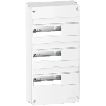 Deze Resi9 CX-behuizing is een opbouwverdeelkast. Deze kunststof behuizing bestaat uit 3 rijen van 13 modules van 18 mm. Het kan alle soorten modulaire schakelapparatuur huisvesten. Deze behuizing is bedoeld voor binneninstallatie. De IP-beschermingsgraad is IP30 zonder deur en IP40 met deur. Er kan een optionele deur over het deksel worden geïnstalleerd. De kleur van de kast is wit (RAL 9003). Het is bedoeld voor nieuwe of gerenoveerde installatie in woningen. De kabels kunnen via de 4 zijkanten of via de achterkant van de behuizing naar binnen. Hij is uitgerust met een optionele achterplaat en een voorplaat met inkeping. Het wordt geleverd met verwijderbare DIN-rail. Het wordt geleverd met aardingsaansluitblok met zijn steun. Het aansluitblok heeft 24 uitgangen (3x25mm²+21x4mm²). Het etiket en de etiketbeschermer, de blindplaat worden ook geleverd binnen het product. Het gedissipeerde vermogen is 55W. De nominale ingangsstroom is tot 90 A. Dit product voldoet aan de normen IEC 61439