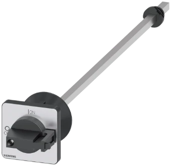 Door-coupling rotary operating mechanism black 48x48 mm, Front plate mounting Central hole mounting 22.5mm with coupling part with shaft 300 mm long, 6x6 mm, accessories for load disconnector 3LD3 Main and EMERGENCY OFF switch SENTRON 3LD3 for the safe shutdown of loads in many areas, e.g. for three-phase motors, air conditioning and ventilation systems, in control or switchgear cabinets, especially for small machines such as saws, compressors, pumps, concrete mixers, drilling machines, milling machines, or woodworking machines. Modular design, fast and easy mounting of auxiliary switches, N-PE terminal, or 4th pole. Optimum disconnection of 16 A of 63 A from the power supply due to the locking capability of the rotary operating mechanism. Versatile thanks to international approvals. One mechanical frame size for five electrical frame sizes. The 3LD main and EMERGENCY-OFF switches are available in a wide range of variants for front mounting, mounting plate, DIN rail, or installation in distribution boards, optionally with direct or door-coupling rotary operating mechanism. 3LD2 is also available in variants for DC applications. Main and EMERGENCY-OFF switch 3LD - End-to-end safety for users and systems.