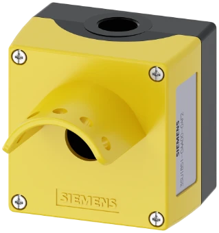 Enclosure for command devices, 22 mm, round, enclosure material metal, enclosure top part yellow, with protective collar for 5 padlocks, emergency stop mushroom 40 mm and emergency stop mushroom 40 mm with key-operated release RONIS, 1 control point, without equipment, floor mounting, top and bottom 1xM20 each Enclosures SIRIUS ACT for mounting the 22.5 mm pushbuttons and indicator lights for separately allocated control units and cabinets. Under the brand name SIRIUS ACT, Siemens offers a unique portfolio of pushbuttons and signaling devices with global product approvals in three modern design lines of rugged genuine metal and high-grade plastic.An innovative snap-on concept makes the task of installing a unit so easy that it can be done with one hand and without any special tools. Groove-free holes are adequate as mounting holes since full twist prevention is already integrated.Thanks to the high degree of protection throughout, the rugged devices are suitable for use in industry and outdoors. Even cleaning with a high-pressure jet is possible. Neither dust, oils, nor caustic solutions can interfere with reliable operation.As well as standard wiring, the devices can also be connected to the controller via PROFINET, AS-Interface or IO-Link. Doing so will help you to reduce wiring time and effort, minimize error sources and have more flexibility.The graphical Online Configurator provides convenient support when selecting and ordering individual devices, enclosures and labels. Extensive documentation (e.g. manual, 3D data, terminal diagram) is available. Versions available: Yellow/gray, plastic/metal, 1-6 command points, empty enclosure/pre-equipped, optionally with AS-Interface connection. SIRIUS ACT - Performance in action for control and signalling. Simply mounted, simply strong, simply perfect.