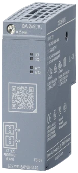 SIMATIC ET 200SP, BusAdapter BA 2xSCRJ, 2 SCRJ FO connections With SIMATIC ET 200SP, Siemens offers a multifunctional and distributed I/O system, which can be commissioned very simply due to its space-saving design. It is approved for degree of protection IP20 and for installation in a compact control box. The system ensures maximum flexibility because you can quickly and simply replace modules at any time due to the multi hot swapping feature. SIMATIC ET 200SP also offers a wide range of different and fast communication methods. With the integrated MultiFieldbus interface module IM155-6MF, you can use the optimum protocol for your application flexibly at any time because this function supports multiple Ethernet protocols. Installation and service are simplified by a standardized identification system based on equipment labeling plates and color-coded connector assignments. Siemens guarantees a future-proof investment due to integration of innovative and long-life automation products. After all, as industry experts, they are already using tomorrow's technologies and thus redefining market standards. Consistent data availability, flexible use cases, and versatile integration options ensure optimum performance of ET 200 products. The scalable, cost-optimized configuration of an ET 200SP station is ensured by the wide range of signal modules. In addition to digital and analog input and output modules, respective fail-safe variants are also available for applications up to SIL 3 / PLe. This also applies to the integrated motor starters, which are suitable for motors up to 5.5 kW. Energy Meters for measuring and analyzing the energy consumption, IO-Link master (V1.1.), and many other communication and technology modules allow the system to be adapted to any automation task.