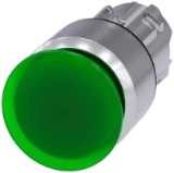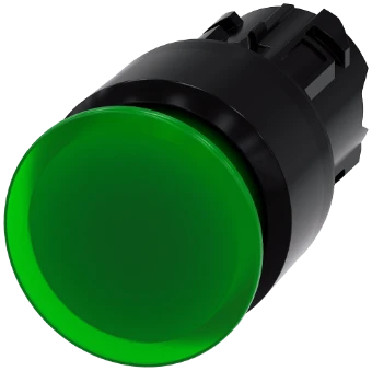 Illuminated mushroom pushbutton, 22 mm, round, plastic, green, 30 mm, latching, Pull-to-unlatch mechanism Mushroom pushbuttons SIRIUS ACT with large actuator for convenient operation using the whole hand. Under the brand name SIRIUS ACT, Siemens offers a unique portfolio of pushbuttons and signaling devices with global product approvals in three modern design lines of rugged genuine metal and high-grade plastic.An innovative snap-on concept makes the task of installing a unit so easy that it can be done with one hand and without any special tools. Groove-free holes are adequate as mounting holes since full twist prevention is already integrated.Thanks to the high degree of protection throughout, the rugged devices are suitable for use in industry and outdoors. Even cleaning with a high-pressure jet is possible. Neither dust, oils, nor caustic solutions can interfere with reliable operation.As well as standard wiring, the devices can also be connected to the controller via PROFINET, AS-Interface or IO-Link. Doing so will help you to reduce wiring time and effort, minimize error sources and have more flexibility.The graphical Online Configurator provides convenient support when selecting and ordering individual devices, enclosures and labels. Extensive documentation (e.g. manual, 3D data, terminal diagram) is available. Versions available: 30/40/60 mm mushroom diameter, several colors, illuminated/non-illuminated, latching/momentary contact operation, pull-to-unlatch/rotate-to-unlatch mechanism. Note: Single device, please order holders and modules separately. SIRIUS ACT - Performance in action for control and signalling. Simply mounted, simply strong, simply perfect.
