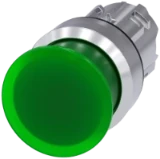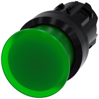 Illuminated mushroom pushbutton, 22 mm, round, plastic, green, 30 mm, momentary contact type Mushroom pushbuttons SIRIUS ACT with large actuator for convenient operation using the whole hand. Under the brand name SIRIUS ACT, Siemens offers a unique portfolio of pushbuttons and signaling devices with global product approvals in three modern design lines of rugged genuine metal and high-grade plastic.An innovative snap-on concept makes the task of installing a unit so easy that it can be done with one hand and without any special tools. Groove-free holes are adequate as mounting holes since full twist prevention is already integrated.Thanks to the high degree of protection throughout, the rugged devices are suitable for use in industry and outdoors. Even cleaning with a high-pressure jet is possible. Neither dust, oils, nor caustic solutions can interfere with reliable operation.As well as standard wiring, the devices can also be connected to the controller via PROFINET, AS-Interface or IO-Link. Doing so will help you to reduce wiring time and effort, minimize error sources and have more flexibility.The graphical Online Configurator provides convenient support when selecting and ordering individual devices, enclosures and labels. Extensive documentation (e.g. manual, 3D data, terminal diagram) is available. Versions available: 30/40/60 mm mushroom diameter, several colors, illuminated/non-illuminated, latching/momentary contact operation, pull-to-unlatch/rotate-to-unlatch mechanism. Note: Single device, please order holders and modules separately. SIRIUS ACT - Performance in action for control and signalling. Simply mounted, simply strong, simply perfect.