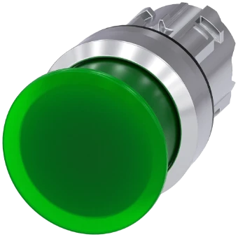 Illuminated mushroom pushbutton, 22 mm, round, metal, shiny, green, 30 mm, momentary contact type Mushroom pushbuttons SIRIUS ACT with large actuator for convenient operation using the whole hand. Under the brand name SIRIUS ACT, Siemens offers a unique portfolio of pushbuttons and signaling devices with global product approvals in three modern design lines of rugged genuine metal and high-grade plastic.An innovative snap-on concept makes the task of installing a unit so easy that it can be done with one hand and without any special tools. Groove-free holes are adequate as mounting holes since full twist prevention is already integrated.Thanks to the high degree of protection throughout, the rugged devices are suitable for use in industry and outdoors. Even cleaning with a high-pressure jet is possible. Neither dust, oils, nor caustic solutions can interfere with reliable operation.As well as standard wiring, the devices can also be connected to the controller via PROFINET, AS-Interface or IO-Link. Doing so will help you to reduce wiring time and effort, minimize error sources and have more flexibility.The graphical Online Configurator provides convenient support when selecting and ordering individual devices, enclosures and labels. Extensive documentation (e.g. manual, 3D data, terminal diagram) is available. Versions available: 30/40/60 mm mushroom diameter, several colors, illuminated/non-illuminated, latching/momentary contact operation, pull-to-unlatch/rotate-to-unlatch mechanism. Note: Single device, please order holders and modules separately. SIRIUS ACT - Performance in action for control and signalling. Simply mounted, simply strong, simply perfect.