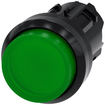 Illuminated pushbutton, 22 mm, round, plastic, green, pushbutton, raised momentary contact type Illuminated pushbuttons SIRIUS ACT for switching and controlling electrical loads. Under the brand name SIRIUS ACT, Siemens offers a unique portfolio of pushbuttons and signaling devices with global product approvals in three modern design lines of rugged genuine metal and high-grade plastic.An innovative snap-on concept makes the task of installing a unit so easy that it can be done with one hand and without any special tools. Groove-free holes are adequate as mounting holes since full twist prevention is already integrated.Thanks to the high degree of protection throughout, the rugged devices are suitable for use in industry and outdoors. Even cleaning with a high-pressure jet is possible. Neither dust, oils, nor caustic solutions can interfere with reliable operation.As well as standard wiring, the devices can also be connected to the controller via PROFINET, AS-Interface or IO-Link. Doing so will help you to reduce wiring time and effort, minimize error sources and have more flexibility.The graphical Online Configurator provides convenient support when selecting and ordering individual devices, enclosures and labels. Extensive documentation (e.g. manual, 3D data, terminal diagram) is available. Versions available: Several colors, illuminated/non-illuminated, with/without inscription, latching/momentary contact operation, various button and front ring heights. Note: Single device, please order holders and modules separately. SIRIUS ACT - Performance in action for control and signalling. Simply mounted, simply strong, simply perfect.