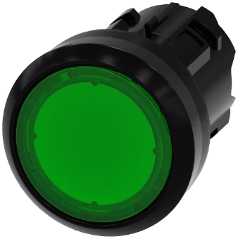 Indicator light in illuminated pushbutton design, 22 mm, round, plastic, green, Indicator lights SIRIUS ACT for signaling switching states or faults in systems with high luminosity, thanks to energy-efficient LED technology. Under the brand name SIRIUS ACT, Siemens offers a unique portfolio of pushbuttons and signaling devices with global product approvals in three modern design lines of rugged genuine metal and high-grade plastic.An innovative snap-on concept makes the task of installing a unit so easy that it can be done with one hand and without any special tools. Groove-free holes are adequate as mounting holes since full twist prevention is already integrated.Thanks to the high degree of protection throughout, the rugged devices are suitable for use in industry and outdoors. Even cleaning with a high-pressure jet is possible. Neither dust, oils, nor caustic solutions can interfere with reliable operation.As well as standard wiring, the devices can also be connected to the controller via PROFINET, AS-Interface or IO-Link. Doing so will help you to reduce wiring time and effort, minimize error sources and have more flexibility.The graphical Online Configurator provides convenient support when selecting and ordering individual devices, enclosures and labels. Extensive documentation (e.g. manual, 3D data, terminal diagram) is available. Versions available: Several colors, different voltage variants. Note: Single device, please order holders and modules separately. SIRIUS ACT - Performance in action for control and signalling. Simply mounted, simply strong, simply perfect.