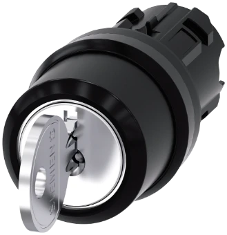 RONIS key-operated switch, 22 mm, round, plastic, lock number SB30, with 2 keys, 3 switch positions IO-II, momentary contact on the left, latching on the right, actuating angle 2x45°, 10:30h/12h/13:30h, key removal O, possible special locks: SB31, 421, 455 Key-operated switches SIRIUS ACT for meeting higher demands for access security. Under the brand name SIRIUS ACT, Siemens offers a unique portfolio of pushbuttons and signaling devices with global product approvals in three modern design lines of rugged genuine metal and high-grade plastic.An innovative snap-on concept makes the task of installing a unit so easy that it can be done with one hand and without any special tools. Groove-free holes are adequate as mounting holes since full twist prevention isalready integrated.Thanks to the high degree of protection throughout, the rugged devices are suitable for use in industry and outdoors. Even cleaning with a high-pressure jet is possible. Neither dust, oils, nor caustic solutions can interfere with reliable operation.As well as standard wiring, the devices can also be connected to the controller via PROFINET, AS-Interface or IO-Link. Doing so will help you to reduce wiring time and effort, minimize error sources and have more flexibility.The graphical Online Configurator provides convenient support when selecting and ordering individual devices, enclosures and labels. Extensive documentation (e.g. manual, 3D data, terminal diagram) is available. Versions available: Various locking systems (Siemens, C; Siemens, B; RONIS, OMR), 2/3 switch positions, latching/momentary-contact operation, various key removal positions. Note: Single device, please order holders and modules separately. SIRIUS ACT - Performance in action for control and signalling. Simply mounted, simply strong, simply perfect.