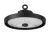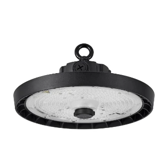 Interior LED Highbay, comes complete with 1500mm flying lead, hook for hanging and 1200mm chain with carabiners, Traffic black (RAL9017) aluminium housing with PC lens, IP65, IK08, Class I, 4000K, CRI80, 0-10V dimmable, 12,500 / 16,500 / 20,600lm (3 different steps selectable with DIP switches), 62 / 82 / 103W, 202 / 201 / 200lm/W depends on setting, Symmetrical Medium beam (55°), 105.000hrs L80B50 lifespan, 298 x 182mm (D x H) dimensions, 2.22kg weight, operating temperature range from -30 to +50°C, Zhagabook 18 socket in the center.