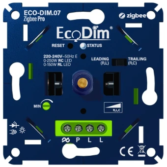 De ECO-DIM.07 Zigbee Pro is een led dimmer met een vermogen van 0-250W LED. De dimmer is geschikt voor beide dimtechnieken (fase aansnijding en fase afsnijding) en heeft een MIN afstelling en automatische MAX detectie. De led dimmer is te bedienen met een druk/draaiknop of Zigbee domotica systeem naar keuze. Deze dimmer is geschikt voor alle A-merken afdekmateriaal. Deze led dimmer is eenvoudig 2-draads te installeren. Door de inbouwdiepte van slechts 23,8mm past deze eenvoudig in alle inbouwdozen.