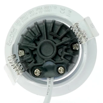 Deze witte ronde led inbouwspot (geschikt voor zaagmaat 55mm) is spatwaterdicht (IP54, geschikt voor badkamer) en heeft een kleine inbouwdiepte van slechts 23mm. Uniek is de uitstekende dimbaarheid en het eenvoudige 2-draads doorlussen dankzij de compacte lasdoos met dubbele klemconnector (2x fase- en 2x nuldraad). Bijzonder is de lichtkleur ‘dim to warm’. Hiermee wordt de lichtkleur ‘warmer’ naarmate u dimt, namelijk van 3000K-2000K. Uitstekend dimbaar met alle EcoDim led dimmers.