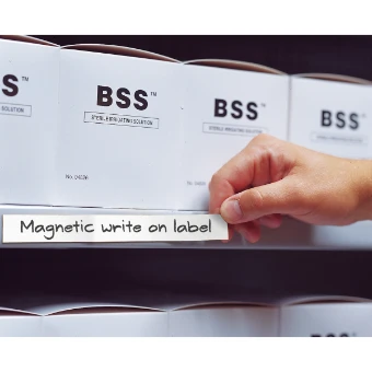 Ideaal voor de identificatie van magazijnen met een voortdurend wijzigende indeling. Deze labels bieden volledige flexibiliteit. Ze kunnen zo vaak als nodig verwijderd en opnieuw worden aangebracht op metalen oppervlakken. Als een product van plaats verandert, verhuist het label gewoon mee. Beschrijf de labels of breng een zelfklevend label aan op het magnetische materiaal