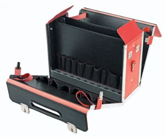 Gereedschapskoffer van sterk rundleer, speciaal voor veiligheidsgereedschappen en -voorzieningen, alle buitenkanten versterkt met aluminium hoeken, zijpanelen, voor- en achterwand, bodem en deksel extra versterkt, voorwand neerklapbaar, afsluitbare steeksloten, zijsluitingen, stevige genopte draaggreep, talrijke steekvakken voor gereedschappen, lussen aan zijkant voor schouderriem, bodemglijders, extra documentenvak aan de voorzijde, neerklapbare achterwand, klapvak voor kleingerei, tussenwand, foaminzetstuk met uitsparingen voor steeksleutelinzetstukken