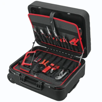 Meisterkoffer Mega-Wheel, dubbelwandige kofferhelften van slag- en breukvast polyethyleen, zeer temperatuurongevoelig en bestand tegen chemische stoffen, 80 mm diepe kofferbodem met scheidingsplaten voor indeling naar keuze, 2 uitneembare platen met nieuwe gepatenteerde Flexipouch-steekvakken voor gereedschappen en kleingerei, royaal tweedelig documentenvak, aan beide zijden een stabiele metalen dekselhouder, 2 grote wielen (98 mm!) met kogellagers voor meer stabiliteit en robuustheid, veilig stapelbaar door 4 rubberen bodemglijders en uitsparingen in het kofferdeksel. De telescoopgreep is onopvallend in de kofferbodem van de koffer geïntegreerd en stoot zo niet bij normaal transport van de koffer. De greep kan tot op de ergonomisch aangename hoogte van 115 cm worden uitgetrokken. Handgreep met zachtrubberen inleg en aanligveren, 2 stevige sleutelsloten, gewicht 8 kg. Compleet met 23 gereedschappen, striptang nr. 10 9686, elektronica-zijkniptang nr. 10 1040, telefoontang, recht nr. 10