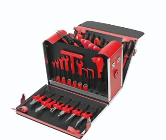 Gereedschapskoffer van sterk rundleer speciaal voor veiligheidsgereedschappen en -voorzieningen, alle buitenkanten versterkt met aluminium hoeken, zijpanelen, voor- en achterwand, bodem en deksel extra versterkt, voorwand neerklapbaar, afsluitbare steeksloten, sluitingen aan de zijkant, zware noppengreep, diverse steekvakken voor gereedschappen, lussen aan de zijkant voor schouderriem, bodemglijders extra met documentenvak aan de voorkant, neerklapbare achterwand, klapvak voor kleingerei, tussenschot, foaminzetstuk met uitsparingen voor steeksleutelinzetstukken compleet met 54 veiligheidsgereedschappen (1000V-isolatie), kunststof klem nr. 10 0796, telefoontang, recht nr. 10 8778, dito, gebogen nr. 10 8780, combinatietang nr. 10 8782, krachtzijkniptang nr. 10 8784, striptang nr. 10 8790, hoekschroevendraaier nr. 11 0804, dito nr. 11 0806, spanningzoeker DUSPOL nr. 11 1430, steeksleutelinzetstukken nr. 11 2600, dito nr. 11 2602, dito nr. 11 2606, dito nr. 11 2608, dito nr. 11 2610, dito