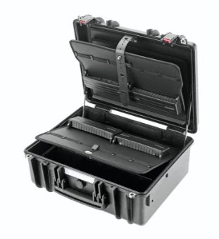 Staub- und wasserdichter Werkzeugkoffer nach IP67, stapelbar, bruch- und stoßfest. Beständig gegen Säure und für Temperaturen von -33°C/+90°C. Bestückt mit einem Dokumentenfach, einem ergonomischen Zwei-Komponenten-Griff und Klappverschlüssen für optionales Vorhängeschloss. Für den Überdruckausgleich wurde der Koffer mit einem manuellen Druckausgleichsventil ausgestattet. Der im Deckel umlaufende O-Dichtring schützt den Inhalt des sehr standfesten und widerstandsfähigen Koffers. Leergewicht Koffer: 6.500 g