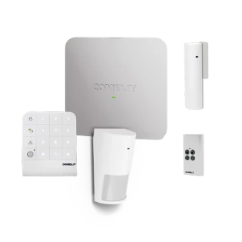 De draadloze inbraakbeveiligingskit KNPIR bestaat uit een centrale NEXUS (art. RFNEXUS), een magneetcontact met een extra bedrade ingang (art. RF1MCW), een infrarood binnensensor (art. RF12PIR) en een afstandsbediening (art. RF4KEYW). De centrale is uitgerust met 4G-, WiFi- en ethernet-interfaces en kan worden beheerd vanuit de Comelit-app NEXUS via de cloud.