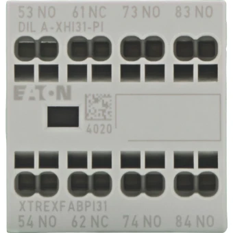 Hulpcontactblokje, met onderling vergrendelde tegenoverliggende contacten, functie: voor standaard toepassingen, 4-polig, aansluittechniek: Push-in klemmen, Ith 16 A, nominale bedrijfsstroom AC-15 220 V 230 V 240 V: Ie= 4 A, nominale bedrijfsstroom AC-15 380 V 400 V 415 V: Ie= 4 A, contacten no = normaal open: 3 no, contacten nc = normaal gesloten: 1 nc, type montage: Frontbevestiging, voor gebruik met: DILA…-PI, DILM7…-PI, DILM9…-PI, DILM12…-PI, DILM15…-PI, DILM17…-PI, DILM25…-PI, DILM32…-PI, DILM38…-PI, DILMP20…-PI, DILMP32…-PI, DILMP45…-PI, DILM8…-PI, DILM11…-PI, DILM14…-PI, type: Hulpcontact voor frontmontage