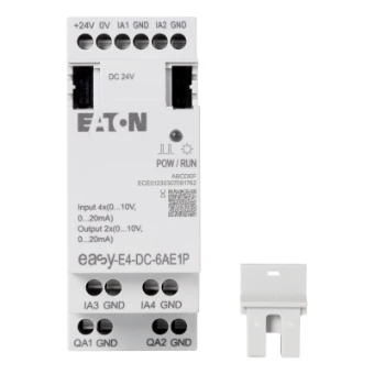I/O-uitbreiding voor stuurrelais in de easye4-serie met een nominale bedrijfsspanning van 24 VDC. Deze uitbreiding biedt: 4 analoge ingangen die kunnen worden gebruikt als spanningsingangen (0-10 V) of stroomingangen (0/4-20 mA) en 2 analoge uitgangen die kunnen worden gebruikt als spanningsuitgangen (0-10 V) of stroomuitgangen (0/4-20 mA). De aansluitingen worden tot stand gebracht met behulp van Push-in klemmen. De verbinding met het stuurrelais of een andere uitbreiding in de easyE4-serie wordt tot stand gebracht met behulp van de EASY-E4-CONNECT1-connector (item 197225), die standaard wordt meegeleverd.
