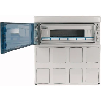 IKA vochtige omgeving compacte verdeler; RAL 7035, met nulleider- en aardklemmen; CNC ingeschuimde pakking voor IP65-beschermingsgraad zoals gedefinieerd in IEC/EN 62208; 18 plaatseenheden; eenrijig; UV-bestendig zoals gedefinieerd in DIN EN ISO 4892-2; goedgekeurd voor verdelers voor gebouwentechniek conform IEC/EN 61439-3 VDE 0660-600-3; geïntegreerde modulecompensatie voor verschillende apparaatbreedten; metrische kabeluitsparingen met centreerpunt: 100% polycarbonaat-behuizing (UV-bestendig)