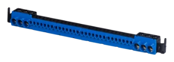 N/N plug-in terminal. Rated current: plug-in positions 32A, screw positions 101A. Connections: screwable 3x 25 mm², pluggable 14x 4 mm². Suitable for rigid copper conductors. Colour blue.