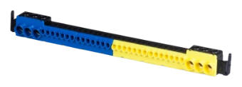 PE/N plug-in terminal. Rated current: plug-in positions 32A, screw positions 101A. Connections: screwable 3x 25 mm², pluggable 14x 4 mm². Suitable for rigid copper conductors. Colour blue/yellow.