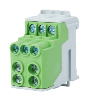 Sub-distribution block. Number of poles 1. Feed terminals: 2x 2.5 - 25 mm². Distribution terminals: 6x 1.5 - 10 mm². Suitable for: CU/AL conductors. Color green/yellow.