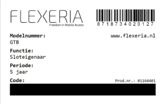 De belangrijkste functie voor een ‘Sloteigenaar’ is sleutelbeheer, waarbij o.a. de volgende functies beschikbaar zijn:• Uitgeven van sleutels• Innemen van sleutels• Toevoegen van extra sloten• Gebeurtenissen logging inzienEerste 3 maanden gratis volledig toegangEen Flexeria ‘slot’ kan alleen door een ‘Sloteigenaar’ bij het Flexeria beheerplatform worden aangemeld. Daarbij krijgt deeigenaar voor ieder ‘slot’ die voor de eerste keer bij het platform wordt aangemeld 3 maanden volledige toegang tot debeheeromgeving voor de ‘Sloteigenaar’.Een ‘Sloteigenaar’ kan via een prepaid code voor een ‘slot’ 5 jaar volledige toegang tot het beheer voor sloteigenarenkrijgen. Wordt er binnen 3 maanden voor een ‘slot’ geen geldige prepaid code ingevoerd, dan kan een ‘Sloteigenaar’ voordat ‘slot’ alleen nog sleutels innemen. Uiteraard blijft de functie om een prepaid code in te voeren beschikbaar, zodat hetvolledige beheer voor betreffende ‘slot’ alsnog geactiveerd kan worden.Na het activeren