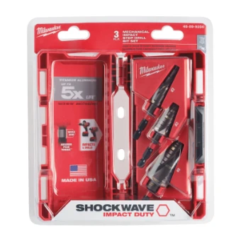 Accessories, Drilling, Metal drilling, Step drill sets, ShW step drill set (3pc), Stapboor sets, SHOCKWAVE™ IMPACT DUTY stappenboren set (3st), Step Drill voordelen ten opzichte van conventionele boren: - Eén boor om meerdere maten te boren - Doe meer met minder! - Beste optie voor het vergroten van bestaande gaten. - Duurzamer dan spiraalboren, dikke kern weerstaat breuk. - Nauwkeuriger en minder lopen, de punt begint bij contact. - Schone braamvrije gaten, minder ruimen nodig. - Boort kunststof zonder splijten of scheuren.