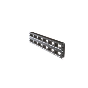 The Mini-Com® Flush Mount Modular Patch Panel accepts up to 48 Mini-Com Modules for unshielded applications in 2 RU, and mounts to 19 inch and 23 inch racks and cabinets. The panel mounts flush with the rack and can be identified with adhesive labels and is black.