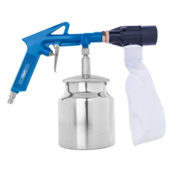 Scheppach luchtzandstraalpistool 7-delig. Scheppach luchtzandstraalpistoolkit. ideaal voor het verwijderen van roestvlekken en het schoonmaken van vlekken.bijzondere kenmerkenluchtwerkdruk van 3 tot 4 barluchtverbruik van 113 liter per minuutrubberen snuit met recycling zak die automatisch zand opvangtde kit bevat: 4 mondblaasstukken, zandblik van 0,5 kg, luchtzandstraalpistool en recycling opvangzak