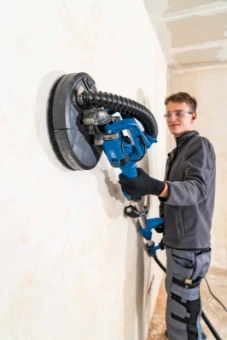 Scheppach schuurmachine DS920X verwijdert verf en behangresten van plafonds, schuine plafonds en wanden. Dit handige en lichte apparaat met telescoopstang en kantelbare schuurkop vereenvoudigt werken boven het hoofd. Met het uitbreide accessoirepakket en de geïntegreerde LED-lamp is deze "langnekschuurmachine" de perfecte hulp op de bouwplaats.