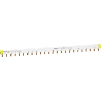 Deze Acti 9 horizontale kamrail met modules van 18mm voor Acti 9 iC60 of Acti 9 iK60 is afsnijdbaar. Dit product is bestemd voor N+1L installaties. Het type is N-L (Neutraal, Lijn). Deze set bestaat uit 1 apparaat. Het is geschikt voor 12 apparaten (1P+N). De lengte is 430mm. Het totaal aantal modules van 18mm is 24. De pindoorsnede is 16mm2. Het type elektrische aansluiting is PIN. Het aantal fasen is 1 en het aantal polen is 2. De Ie nominale bedrijfsstroom bij 40°C is 100A. De Isc-kortsluitstroom is compatibel met de afschakelcapaciteit van Schneider Electric vermogensschakelaars. De Ui nominale isolatiespanning is 500VAC. De Ue nominale bedrijfsspanning is 415 V AC. De kleur van het apparaat is wit (RAL 9003). De vervuilingsgraad is 3. Volgens de IEC 60695-2-1 norm is de brandwerendheid bij 960°C binnen 30 jaar zelfdovend. Het voldoet aan de IEC 60947-7-1 en IEC 61439-2 normen.