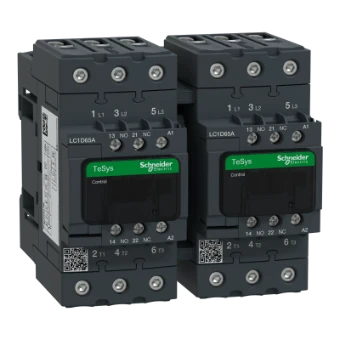 TeSys deca omkeercontactor, 3 polen (3NO), voor motorbesturingstoepassingen tot 65A/590V AC-3 (30kW@400V). Voorzien van 48V 50/60Hz AC-spoelen, 2NO+2NC ingebouwde hulpcontacten (NC-spiegelcontacten), voedingsaansluiting met EverLink-BTR-schroefconnectoren, regeling met schroefklemmen. Voor operationele snelheden tot 3600 cycli/uur en omgevingen tot 60°C, biedt deze een hoge betrouwbaarheid en duurzaamheid. Compact (119 mm breed), DIN-rail montage of schroefbevestiging. Met voorbedrade stroomverdelingsaansluitingen, mechanische vergrendeling (zonder elektrische vergrendeling). Multi-standaarden gecertificeerd (IEC, UL, CSA, CCC, EAC, Marine), Green Premium-conform (RoHS/REACh).