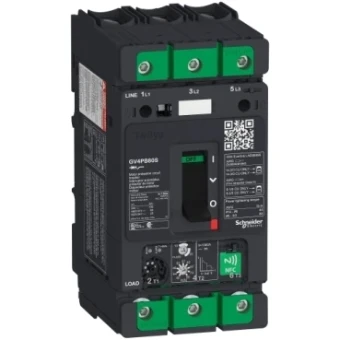 TeSys GV - Vermogensschakelaar - 3P - 80A/690V - Voor beveiliging van 3-fase motoren: 22-37kW@400V. De multifunctionele vermogenschakelaar die voldoet aan UL489 biedt thermische magnetische beveiliging en geavanceerde motorbeveiliging, uitschakelvermogen Icu 100kA@400V, startstop met schakelaar, aansluiting met Everlink BTR schroefklemmen. Thermische beveiliging instelbaar via wijzerschalen met een instelstroom Ir in bereik 40-80A, een selecteerbare uitschakelklasse 10 of 20, nominale uitschakelstroom 125%, magnetische beveiliging bij 17 In. Geavanceerde beveiligingen zijn aanpasbaar met een smartphone die gebruik maakt van een draadloze NFC en omvatten korte-termijnbescherming Isd met een instelbereik van 5-13 Ir, faseonbalans en verliesbescherming, aardfoutbeveiliging, vergrendelde rotor (jam), lange start. Deze kaart stelt interne locaties beschikbaar voor extra hulpcontactblokken (OF, SD) en spanningsuitschakelunits (MN, MX). De UPS kan extern worden uitgerust met 1 of 2 extra SDx-