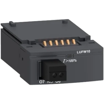 TeSys U - Extra functiemodule die in geavanceerde voedingsbasissen LUB120, LUB320, LUB380 moet worden geplaatst voor alarm bij thermische overbelasting. Deze biedt 1NO direct contact met 2A 230V AC / 24V DC, een LED-status op het voorpaneel. Het alarm wordt geactiveerd wanneer de status voor thermische overbelasting meer dan 88% van de status voor thermische uitschakeling bedraagt, met een hysterese van 5% tussen activering en uitschakeling. Hij wordt gevoed door de regeleenheid. Gecertificeerd bij gebruik in combinatie met een LUB-voedingsbasis (IEC, UL, CSA, CCC, EAC, Marine), conform Green Premium (RoHS/REACh).