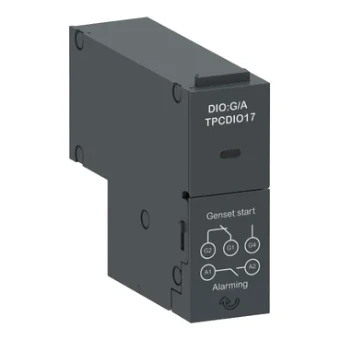 TPCDIO17 is uitgangsmodule als signaleringstoebehoren. Deze functionele module is een hulpcontact voor Gen start en een alarmsignaal. De nominale bedrijfsstroom (Ie) is 5A @250VAC/30VDC. Het startsignaal voorkomt dat de motor droog aanslaat doordat de generator op de juiste manier wordt gezet. Het kan worden gebruikt voor de duur van de instelling voor afkoelen, als de normale bron wordt hersteld en de belasting wordt teruggezet naar normaal. De alarmsignaaluitvoer informeert de gebruiker bij een kritiek alarm, inclusief faserotatie-/overdrachtsstoringen/Micro-schakelaar, en alle gesloten/interne fouten zijn opgetreden. De condensator is bedoeld voor het vertragen van het starten van de motor, dat wil zeggen vóór de generatorstart, ongeacht of dit met of zonder externe 24VDC gebeurt.