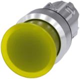 Illuminated mushroom pushbutton, 22 mm, round, plastic, yellow, 30 mm, momentary contact type Mushroom pushbuttons SIRIUS ACT with large actuator for convenient operation using the whole hand. Under the brand name SIRIUS ACT, Siemens offers a unique portfolio of pushbuttons and signaling devices with global product approvals in three modern design lines of rugged genuine metal and high-grade plastic.An innovative snap-on concept makes the task of installing a unit so easy that it can be done with one hand and without any special tools. Groove-free holes are adequate as mounting holes since full twist prevention is already integrated.Thanks to the high degree of protection throughout, the rugged devices are suitable for use in industry and outdoors. Even cleaning with a high-pressure jet is possible. Neither dust, oils, nor caustic solutions can interfere with reliable operation.As well as standard wiring, the devices can also be connected to the controller via PROFINET, AS-Interface or IO-Link. Doing so will help you to reduce wiring time and effort, minimize error sources and have more flexibility.The graphical Online Configurator provides convenient support when selecting and ordering individual devices, enclosures and labels. Extensive documentation (e.g. manual, 3D data, terminal diagram) is available. Versions available: 30/40/60 mm mushroom diameter, several colors, illuminated/non-illuminated, latching/momentary contact operation, pull-to-unlatch/rotate-to-unlatch mechanism. Note: Single device, please order holders and modules separately. SIRIUS ACT - Performance in action for control and signalling. Simply mounted, simply strong, simply perfect.